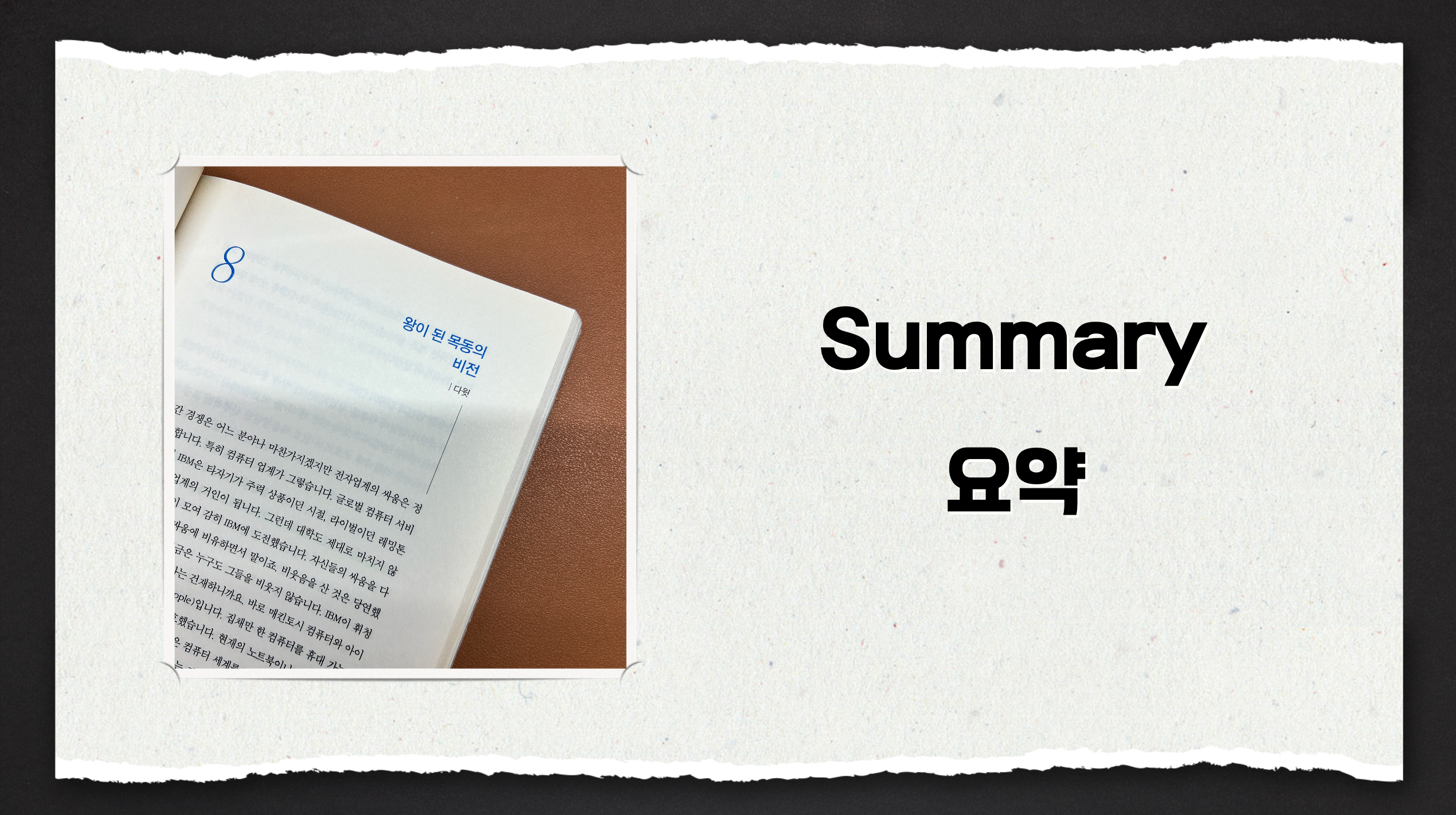 p.158 "... 우리에게도 회복되어야 할 것들이 있습니다. ... 어려운 시절 하나님의 말씀을 사모하던 열정을 회복해야 합니다. ... 우리에게 행하신 여호와의 놀라운 일들을 기억하며 그의 영광을 열방에 선포하려는 비전 말입니다."