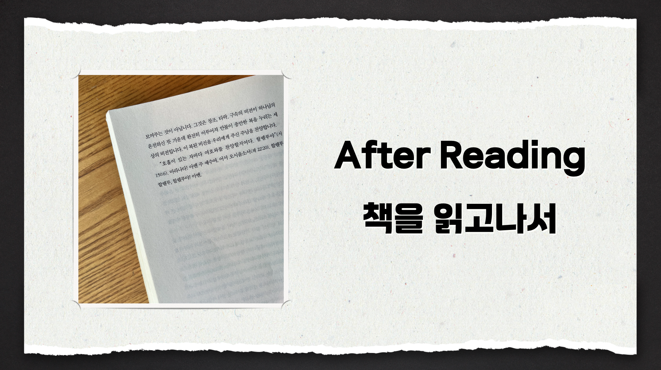 다시 한번 내가 이 세상에서 나그네와 같이 살아가면서 하나님의 나라 저 천국을 바라보면서 살아가는 사람이라는 것을 깨닫게 된다면 더 이상 나의 삶의 목적은 세상의 다양한 물질적인 가치들이 아닌 하나님께서 보여주신 것들이 될 수 있다는 것을 확신하게 되었다. 다시 한번 나도 이 책의 마지막 부분에서 나오듯이 "마라나타! 아멘 주 예수여, 어서 오시옵소서!"를 고백하면서 살아가는 믿음과 소망을 회복하는 계기가 되기를 소망한다.