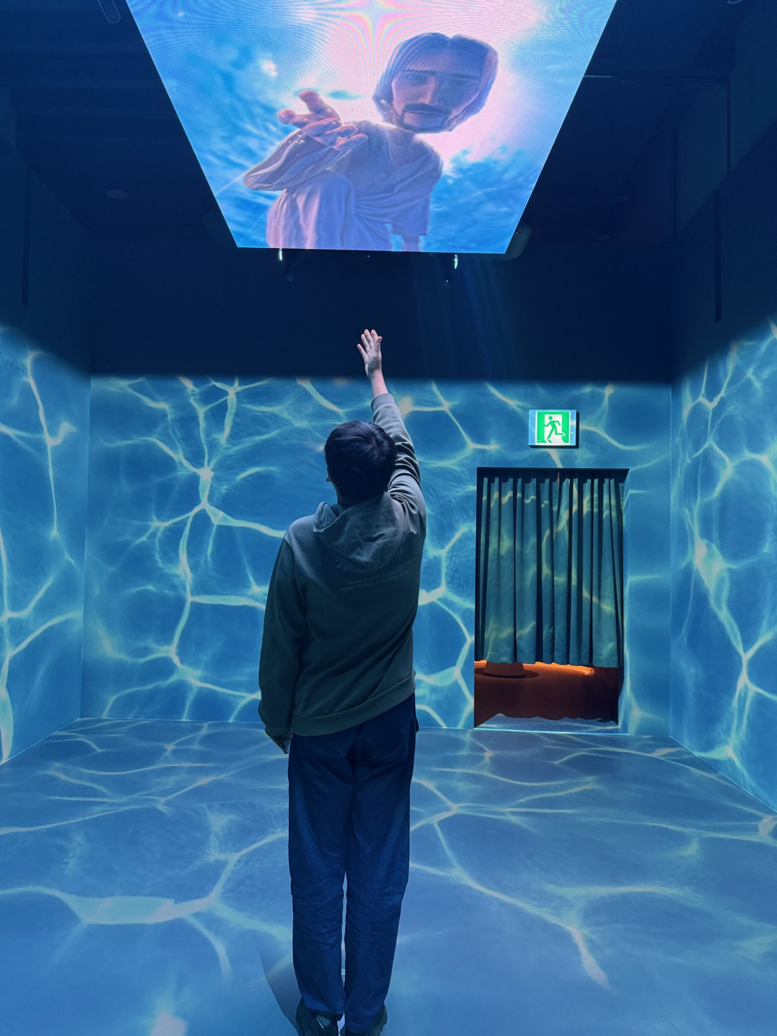 전시의 핵심은 ‘예수님의 사랑’ 그 자체다. 영화에서 스쳐 지나갔던 장면들이 전시장에서는 하나의 신학적 메시지를 중심으로 재구성되어 있다. 그 중에서도 가장 강렬했던 장면은 물속에 빠진 베드로를 예수님이 붙드시는 순간을 실제로 체험하도록 만든 공간이었다.