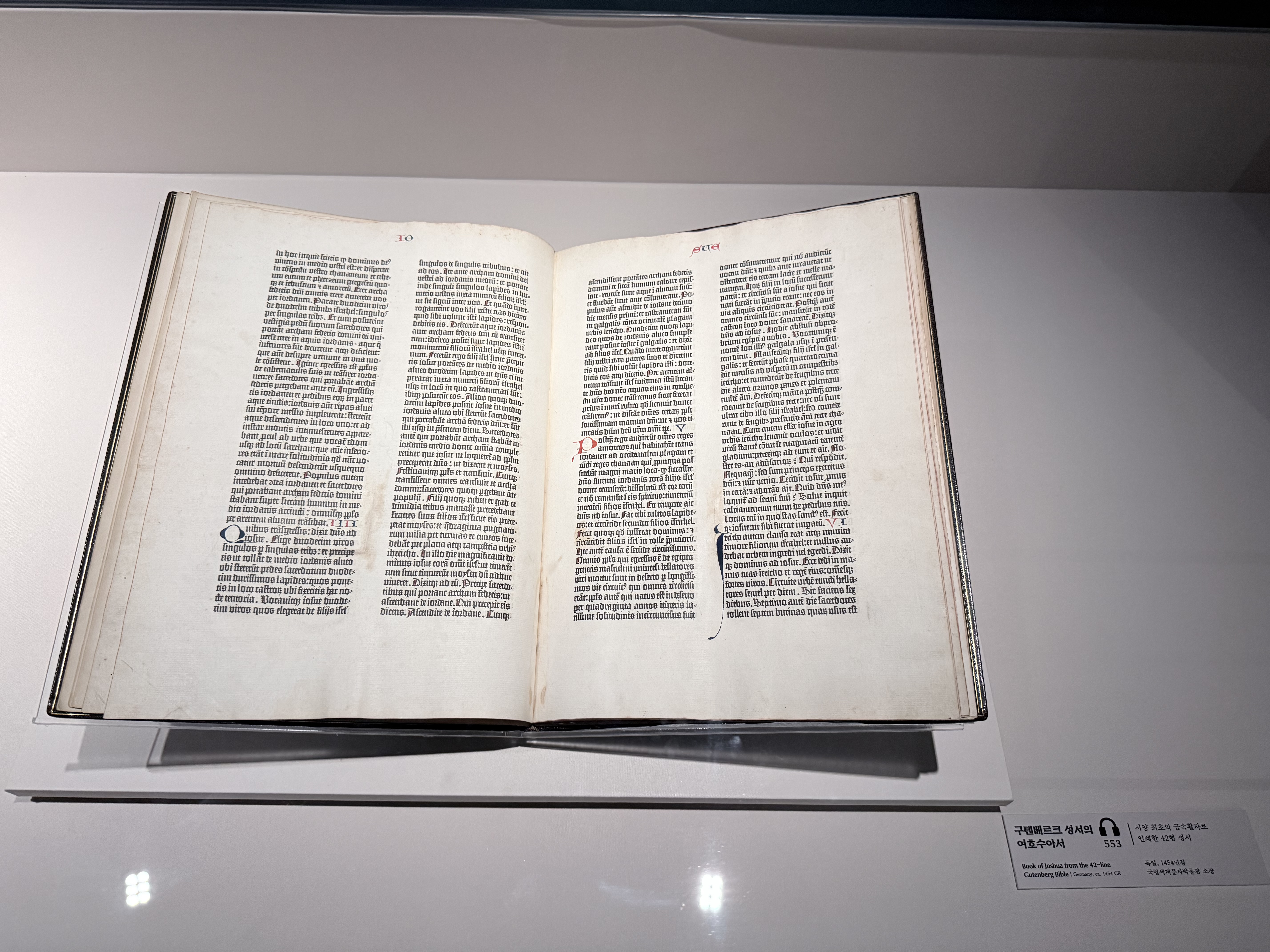 The National Museum of World Writing tells this story with remarkable clarity. Here, one can encounter treasures such as the Codex Sinaiticus, one of the oldest surviving Greek manuscripts of the New Testament; the Gutenberg Bible, the first great product of movable type; Luther’s German Bible; and the earliest Korean New Testament, the Yesu Seonggyo Seongseo.