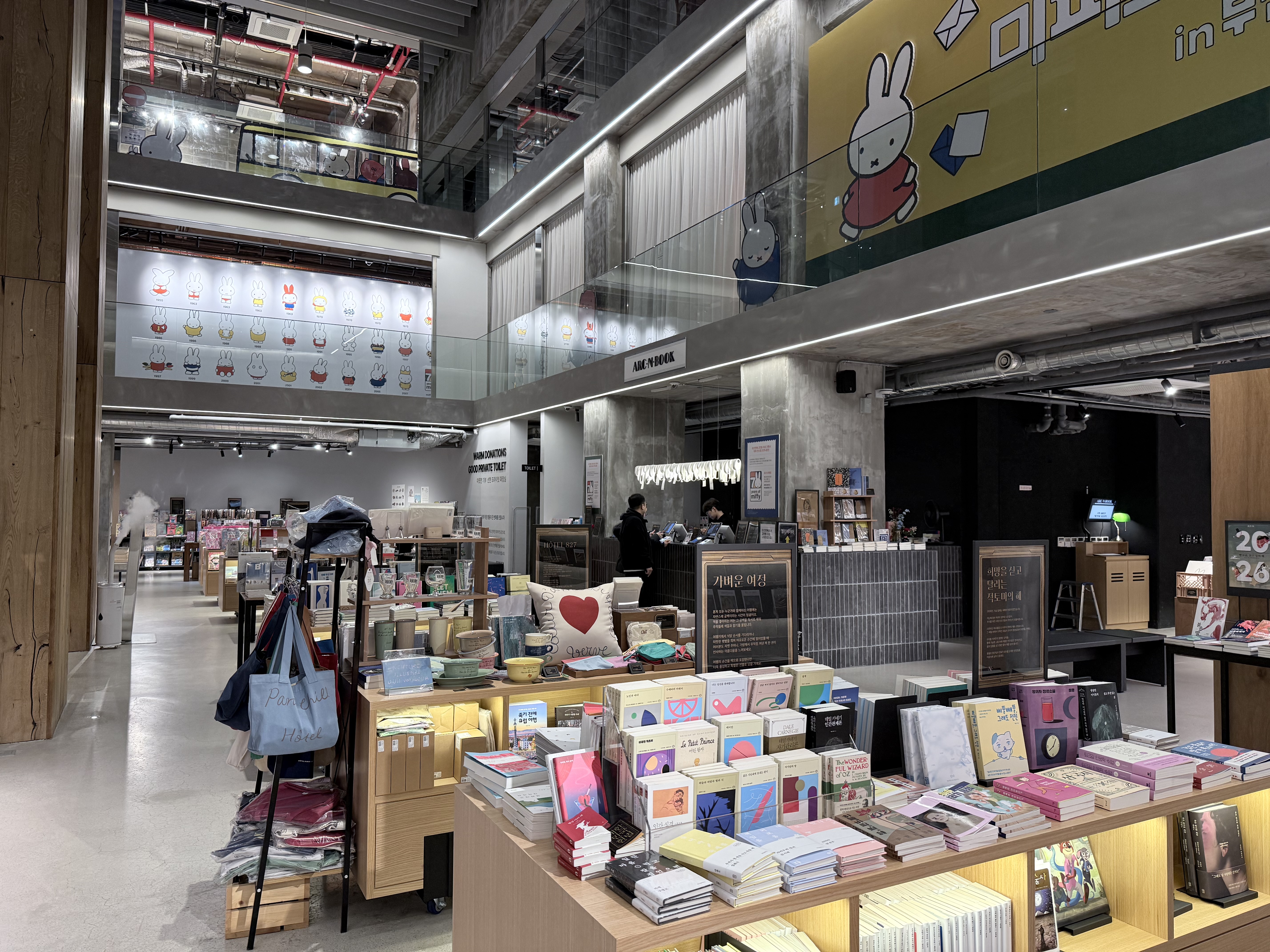 A visit to Arc N Book Gwangalli makes this philosophy immediately tangible. The store spans two floors: the lower level houses books and lifestyle goods, while the upper level functions as an exhibition and event space. During my visit, a Miffy exhibition was on display, reinforcing the sense that this is not simply a bookstore, but a place where reading naturally coexists with visual culture.