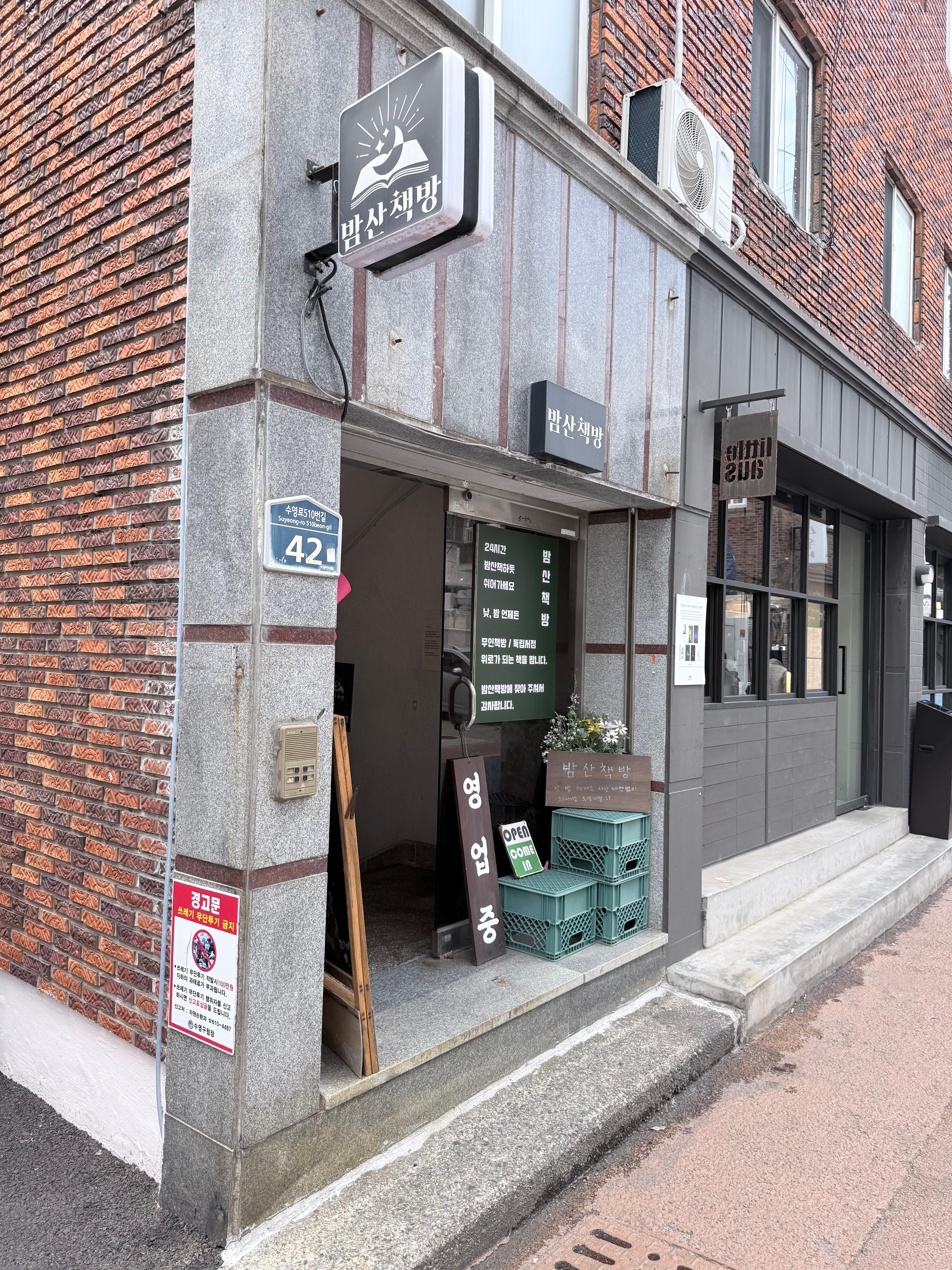 Bamsanchaekbang, a 24-hour unmanned independent bookstore in Gwangalli, is located about five minutes on foot from Arc N Book and roughly ten minutes from Gwangalli Beach. Situated at the edge of a quiet residential alley, the bookstore maintains a subtle connection to the sea—visible in the distance during the day and felt more deeply at night.