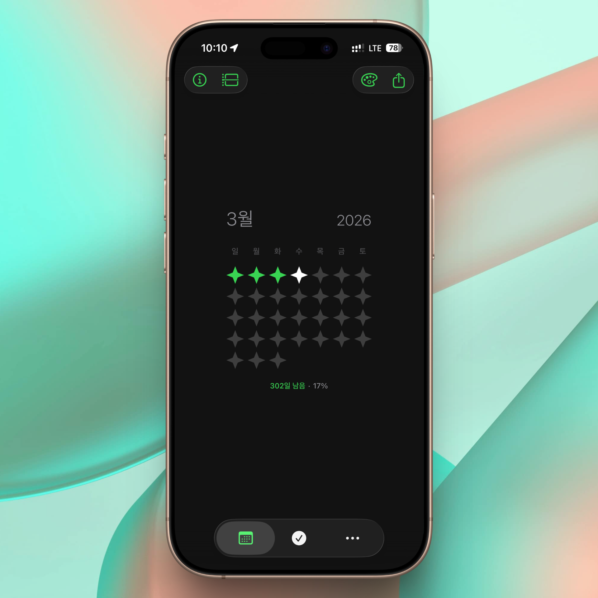 앱은 크게 두 영역으로 나뉜다. 하나는 연간·월간 일정의 진행 상황을 시각화해 주는 캘린더 기능이고, 다른 하나는 습관과 목표를 관리하는 루틴 기능이다. 먼저 일정 부분을 살펴보자.