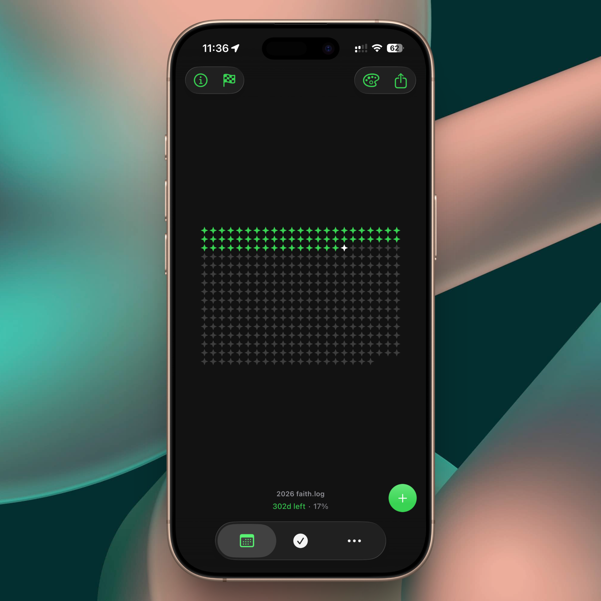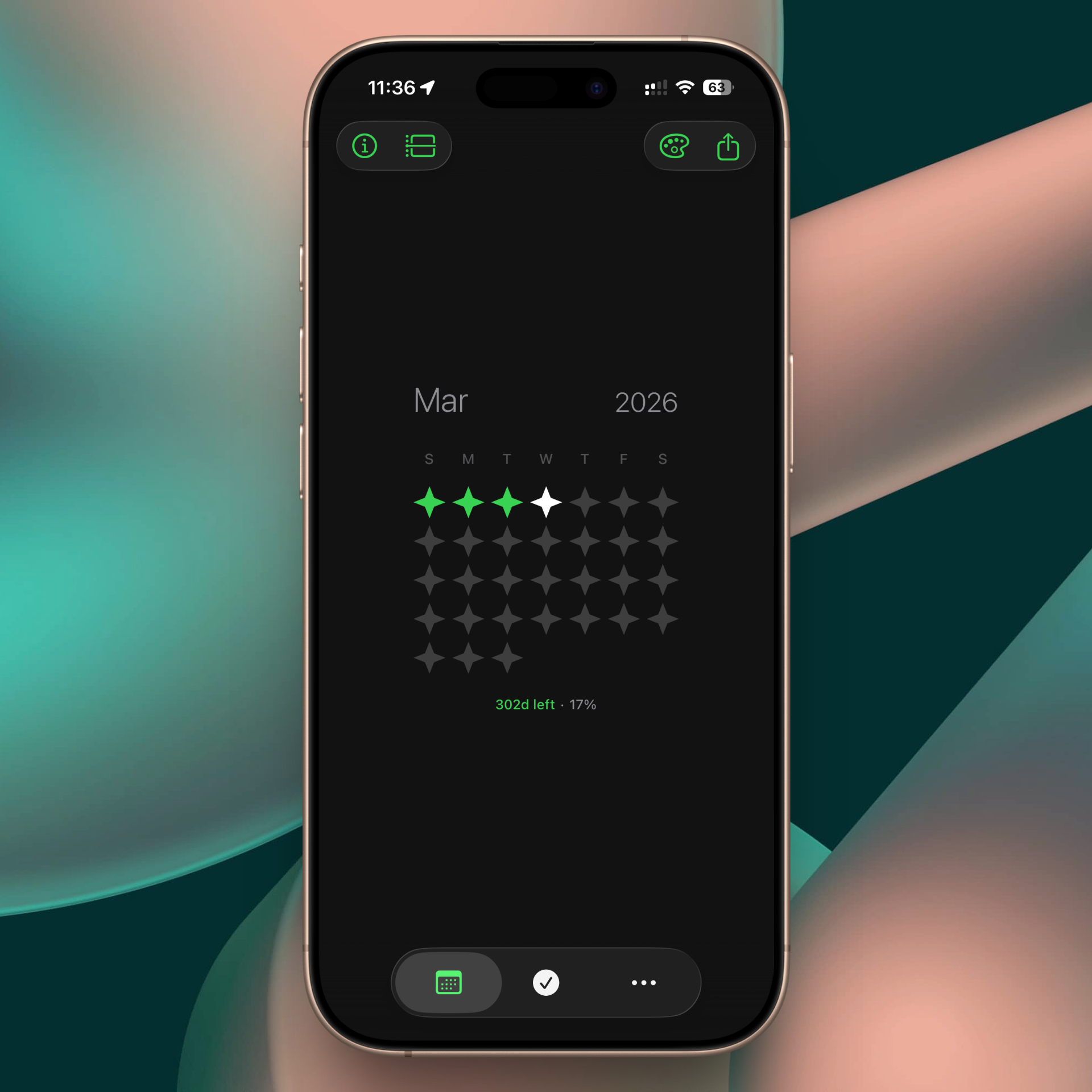 The default view is your annual progress. As of the time of writing (March 5th), there are 301 days remaining in 2026 — meaning 17% of the year has already passed. Seeing that number laid out plainly has a way of making you sit up a little straighter.