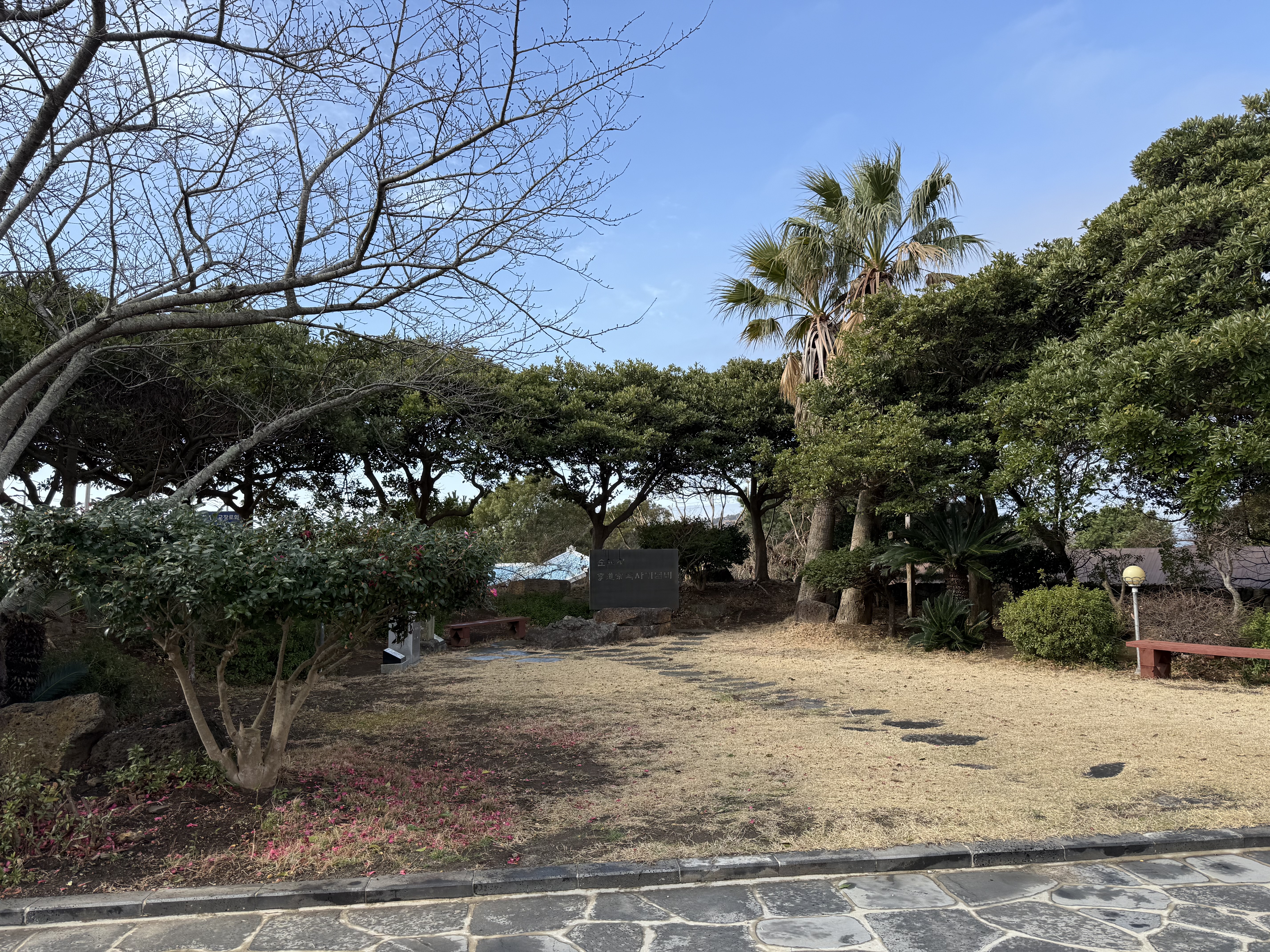 In the courtyard, you'll encounter a memorial stele and an ossuary monument honoring Pastor Lee. The stele, carved from stone quarried at Sanbangsan Mountain, is particularly striking. Most of Jeju's volcanic rock is porous basalt — riddled with holes — and so the congregation sent people all the way to Sanbangsan to find solid stone suitable for carving. The inscription was cut by hand. That effort alone tells you something about what this man meant to his people.